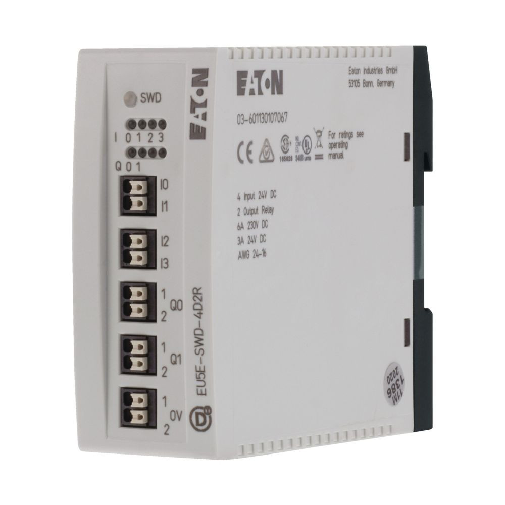 SmartWire-DT Teilnehmer zum Anschluss digitaler E/A-Signale, automatische Adresseinstellung, Modul mit 4 digitalen Eingängen 24VDC, 2 digitale Relaisausgänge 250 V AC, 3 A, Anschluss mit Push-In Klemmen