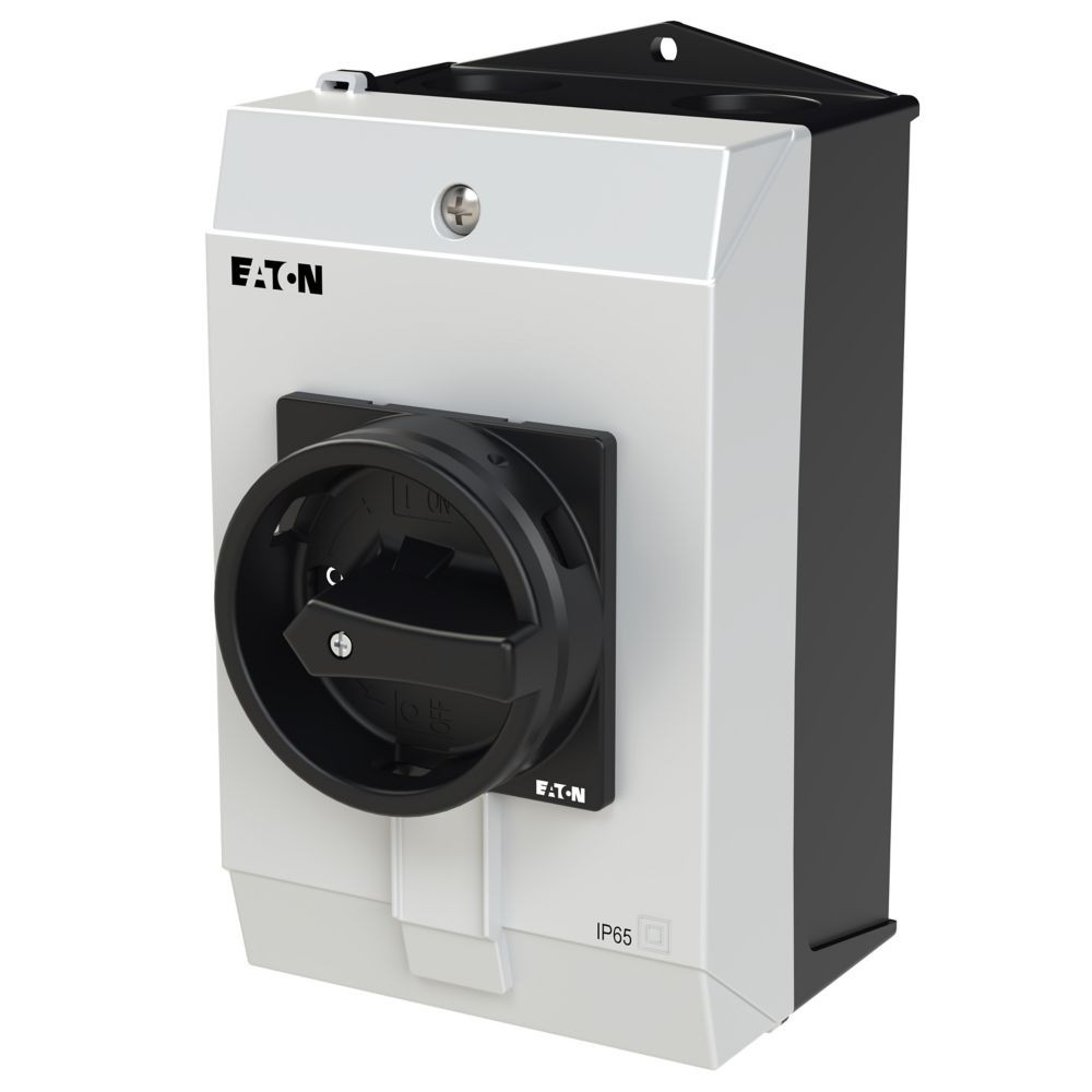 Hauptschalter, P1, Bemessungsdauerstrom (Iu): 25 A, Funktionen: HALT-Funktion, Verriegelbar, Ausstattung: Schwarzer Drehgriff und Sicherungsring, Montageart: Aufputzmontage, Polzahl: 3-polig, Verriegelungsvorrichtung: In der Position 0 (Aus) verriegelbar, Schutzart: NEMA 12
