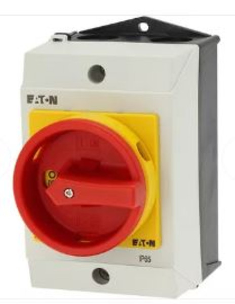 Hauptschalter, Sortiment: Hauptschalter, Wartungsschalter, Reparaturschalter, Typkenner: T0, Stopp-Funktion: NOT-AUS-Funktion, mit rotem Drehgriff und gelbem Sperrkranz, 1-polig, Verriegelungsvorrichtung: In der Position 0 (Aus) verriegelbar, Schutzart: IP65, Bauform: Oberflächenmontage, Schaltwinkel: 90 °, Bemessungsbetriebsleistung AC-23A, 50 - 60 Hz 400 V: P = 5,5 kW, Bemessungsdauerstrom: Iu = 20 A, 1 Baueinheit(en), Normen und Bestimmungen: IEC/EN 60947, VDE 0660, IEC/EN 60204, Lasttrennschalter nach IEC/EN 60947-3