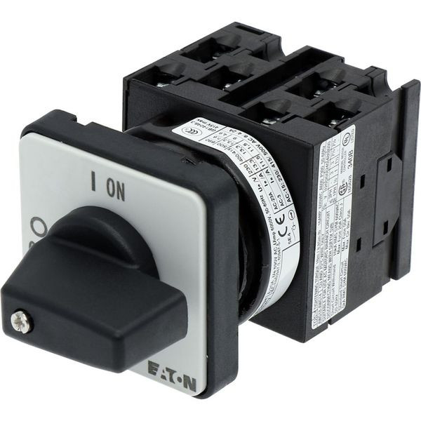 EIN-AUS-Schalter, Sortiment: EIN-AUS-Schalter, Typkenner: T0, mit schwarzem Knebel und Frontschild, 6-polig, Schutzart: Front IP65, Bauform: Einbau, Schaltwinkel: 90 °, Schaltverhalten: rastend, Frontschild: 0-1, Bemessungsbetriebsleistung AC-23A, 50 - 60 Hz 400 V: P = 5,5 kW, Bemessungsdauerstrom: Iu = 20 A, 3 Baueinheit(en), Normen und Bestimmungen: IEC/EN 60947, VDE 0660, IEC/EN 60204, CSA, UL, Lasttrennschalter nach IEC/EN 60947-3