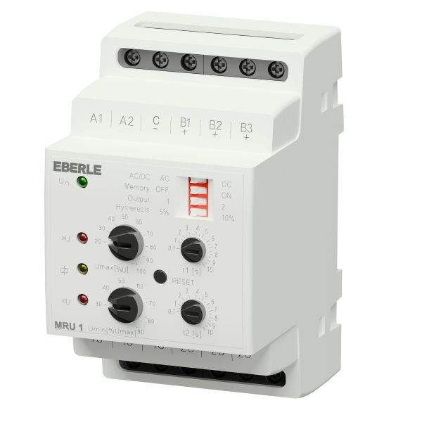 Das Überwachungsrelais MRU 1 dient der Überwachung von Wechsel- oder Gleichspannungen für den Einstellbereich AC/DC 10 ...500V. Es überwacht die Spannungsgröße innerhalb zwei unabhängig einstellbarer Grenzwerte (Umin, Umax). Über den frontseitigen DIP Schalter wird zwischen AC und DC; Über- und Unterspannung mit oder ohne Speicherfunktion gewählt.