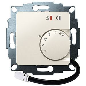 Elektronisches Unterputzthermostat eignet sich für die Regelung von Elektro Fussboden- und Wand-/Decken Heizung. Regelung oder Überwachung von Temperaturen in Wohnräumen, Büros und Hotels. Passend in alle gängigen Schalterprogramme. Cremeweiß glänzend, 50x50 Abdeckung mit Knopf. Verschiedene Parameter können am Gerät eingestellt werden: Fernfühler, Limit, Temperaturabsenkung, Strom sowie Regelalgorithmus (Pulsweitenmodulation oder 2 Punkt Regelung). Bei Beschalten der Uhren-Klemme wird auf eine geringere Temperatur geregelt (einstellbar 3,5C / 6C / 9C). Mit LED-Statusanzeigen. Netzschalter (Ein/Aus) über Einstellrad bedienbar. Einstellbare Bereichseinengung im Einstellknopf als Heizkostenbremse. Eine unverlierbare Schraube mit Gewindeeinsatz zur Befestigung des Gehäusedeckels sowie praktische Steckklemmen erleichtert die Montage. Mit 4m Fernfühler im Lieferumfang. Montage in 55er UP-Dose.
