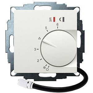Elektronisches Unterputzthermostat eignet sich für die Regelung von Elektro Fussboden- und Wand-/Decken Heizung. Regelung oder Überwachung von Temperaturen in Wohnräumen, Büros und Hotels. Passend in alle gängigen Schalterprogramme. Polarweiß matt, 55x55 Abdeckung mit Knopf. Verschiedene Parameter können am Gerät eingestellt werden: Fernfühler, Limit, Temperaturabsenkung, Strom sowie Regelalgorithmus (Pulsweitenmodulation oder 2 Punkt Regelung). Bei Beschalten der Uhren-Klemme wird auf eine geringere Temperatur geregelt (einstellbar 3,5C / 6C / 9C). Mit LED-Statusanzeigen. Netzschalter (Ein/Aus) über Einstellrad bedienbar. Einstellbare Bereichseinengung im Einstellknopf als Heizkostenbremse. Eine unverlierbare Schraube mit Gewindeeinsatz zur Befestigung des Gehäusedeckels sowie praktische Steckklemmen erleichtert die Montage. Mit 4m Fernfühler im Lieferumfang. Montage in 55er UP-Dose.