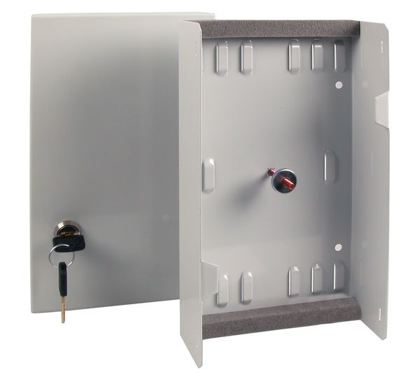 Gehäuse mit Klappdeckel abschließbar, 2 Schlüssel, 2 Öffnungen mit staubdichten Leisten für ankommende und abgehende Kabel, zur Befestigung mit Kabelbindern, für max. 4 Spleißkassetten oder 1 Spleißkassette plus eine Verteilerplatte, Stahlblech 1,5 mm, grau, RAL 7035 Gehäuse mit Klappdeckel abschließbar, 2 Schlüssel