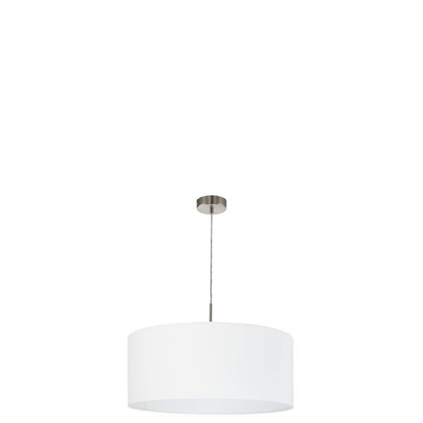 Die Pendelleuchte PASTERI ist aus einem runden weißen Textilschirm gefertigt, der mit einer nickel-matten Metall-Abhängung kombiniert wurde. Die Pendelleuchte im zeitlosen Design fügt sich nahtlos in minimalistische und moderne Einrichtungen ein. Sie bietet mit ihrem Durchmesser von 53 cm eine wohnliche Beleuchtung für jeden Raum – egal ob im Wohnzimmer oder im Esszimmer beispielsweise über einem länglichen Esstisch. Das Leuchtmittel ist nicht im Lieferumfang enthalten. Geeignet ist die Leuchte für jedes Leuchtmittel mit E27-Sockel.