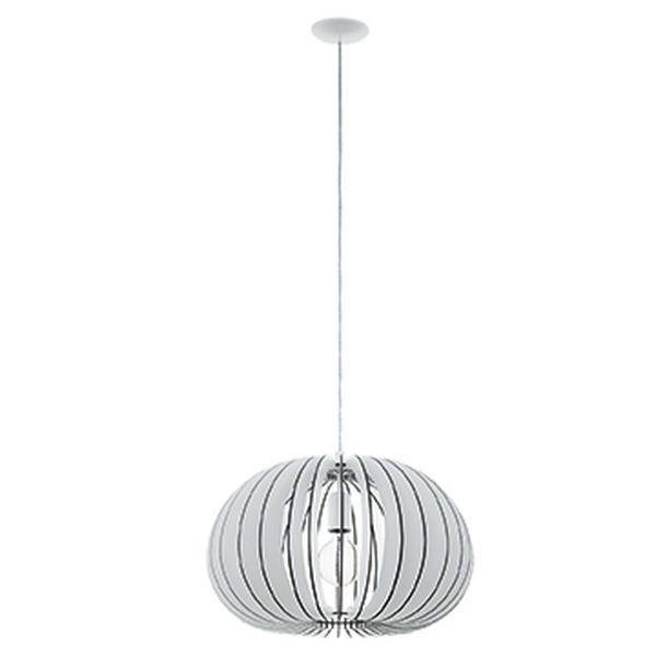 Die Pendelleuchte COSSANO ist mit einem ovalen Lampenschirm aus weißen Holz-Lamellen gefertigt, der von einem weißen Metall-Baldachin abgehängt wurde. Die Lamellen sorgen im eingeschalteten Zustand für faszinierende Licht- und Schattenspiele. Die Hängelampe fügt sich mit ihrem Durchmesser von 45 cm nahtlos in moderne Einrichtungsstile ein und bietet eine wohnliche Beleuchtung im Wohnzimmer oder im Esszimmer über dem Esstisch. Das Leuchtmittel ist nicht im Lieferumfang enthalten. Geeignet ist die Holzleuchte für jedes Leuchtmittel mit E27-Sockel.