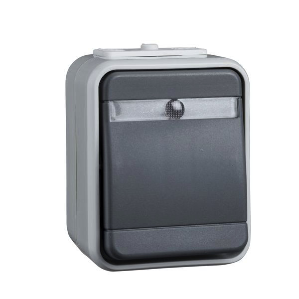 Wechsel-Kontrollschalter, 10 A 250V AC. Farbe: licht-/basaltgrau, mit lichtintensiver Glimmlampe, für Aufputzmontage. Schutzart IP 44, mit zwei Leitungseinführungen, Steckklemmen: Klemmbereich für Informationsleitungen ab Leitungsdurchmesser 0,5mm, für Kupferleiter 1,5 mm und 2,5 mm.