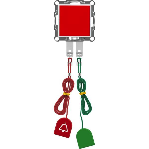 Zugtaster-/Zugabstelltaster mit Zentralplatte Schnur 3m/1m SIGMA care ELSO Joy. Der Zugruf- und Abstelltaster dient zum Auslösen eines Rufes, sowie zum Abstellen eines Rufes durch das Personal. Eine optische und akustische Signalisierung wird an einem sichtbar montierten Zimmermodul außerhalb des Raumes angezeigt. Rote Zugschnur in 3 m Länge und rotes Griffstück mit Rufsymbol, Rundum rot leuchtende Gehäuseseiten, die Rufauslösung anzeigen. Grüne Zugschnur in 1 m Länge und grünes Griffstück zur Abstellung des Rufes, Eine Arretierungsnase auf der. Geräterückseite, hält das Gerät bei starkem Zug im Rahmen. Die Montage erfolgt senkrecht auf einer 60er UP-Dose, z. B. in einem behindertengerechten WC. Betriebsspannung: DC 24 V ± 10 %, über das Zimmermodul ELG745010. Stromaufnahme: max. 45 mA, Anschlussklemme: Steckklemme, 4-polig, 2 Leiter je Pol, Leitungstyp: J-Y(St)Y, 2 x 2 x 0,8 mm, Schutzart: IP20, Leitungslänge: max. 50 m, Abmessungen (B x H x T): 55 x 55 x 20 mm. Bei Verwendung in den Designs ELSO Fashion/Riva/Scala ist ein zusätzlicher Adapterrahmen perlweiß: 203160, reinweiß: 203164 erforderlich.