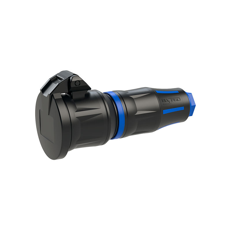 Vollgummi-Schutzkontaktkupplung 3 pol. / 16 A / 230 V / schwarz blau - mit Klappdeckel - vernickelte Kontakte - Schutzart IP 54 - für einen Leitungsdurchmesser 6-14 mm - mit metrischer Verschraubung - Anschlussquerschnitt flexibel 3G1,0 - 3G2,5 mm² - Anschlussart Schraubklemme - Gehäusematerial PA6 2K gummiert - mit aussenliegender Zugentlastung - entspricht der Norm DIN 49440/441 - Umgebungstemperatur EA -25 bis +40 °C - Abmessungen 142x70 mm - Gewicht 0,14 kg