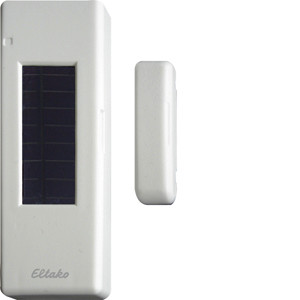 Funk-Fenster-Türkontakt mit Solarzelle 75x25x12mm, reinweiß glänzend. Befestigung durch Kleben. Schutzart IP54, daher auch für Außenmontage. Smart Home Sensor.