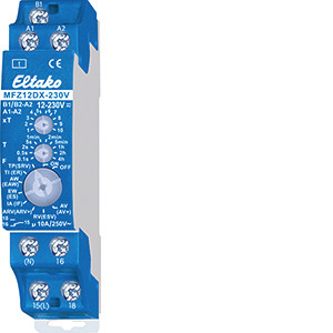 Wechsler potenzialfrei 10A/250 V AC, 230V-LED-Lampen bis 200W, Glühlampen 2000W*. Stand-by-Verlust nur 0,4 Watt. Reiheneinbaugerät für Montage auf Tragschiene DIN-EN 60715 TH35. 1 Teilungseinheit = 18 mm breit, 58 mm tief. Mit der patentierten ELTAKO-Duplex-Technologie (DX) können die normalerweise potenzialfreien Kontakte beim Schalten von 230 V-Wechselspannung 50 Hz trotzdem im Nulldurchgang schalten und damit den Verschleiß drastisch reduzieren. Hierzu einfach den N-Leiter an die Klemme (N) und L an 15 (L) anschließen. Dadurch ergibt sich ein zusätzlicher Stand-by-Verlust von nur 0,1 Watt. Versorgungs- und Steuerspannung 230V AC. Zeiten zwischen 0,1 Sekunden und 40 Stunden sind einstellbar. Funktion F (Beschreibung Seite 13-22) RV = Rückfallverzögerung AV = Ansprechverzögerung TI = Taktgeber mit Impuls beginnend TP = Taktgeber mit Pause beginnend IA = Impulsgesteuerte Ansprechverzögerung (z.B. automatischer Türöffner) EW = Einschaltwischer AW = Ausschaltwischer ARV = Ansprech- und Rückfallverzögerung ON = Dauer EIN OFF = Dauer AUS Die Leuchtdiode unter dem großen Drehschalter informiert während des Zeitablaufes über die Kontaktstellung. Sie blinkt, solange der Arbeitskontakt 15-18 offen ist (15-16 geschlossen) und leuchtet ständig, solange der Arbeitskontakt 15-18 geschlossen (15-16 offen) ist. Die Zeitbasis T wird mit dem mittleren rastenden Drehschalter T eingestellt. Als Basiswerte stehen 0,1 Sekunde, 0,5 Sekunden, 2 Sekunden, 5 Sekunden, 1 Minute, 2 Minuten, 5 Minuten, 1 Stunde, 2 Stunden und 4 Stunden zur Wahl. Die Gesamtzeit ergibt sich aus der Zeitbasis multipliziert mit dem Multiplikator. Der Multiplikator xT wird mit dem oberen rastenden Drehschalter xT eingestellt und liegt zwischen 1 und 10. Somit lassen sich Zeiten zwischen 0,1 Sekunde (Zeitbasis 0,1 Sekunde und Multiplikator 1) und 40 Stunden (Zeitbasis 4 Stunden und Multiplikator 10) einstellen. * Die maximale Last kann ab einer Verzögerungs- oder Taktzeit von 5 Minuten genutzt werden. Bei kürzeren Zeiten reduziert sich die maximale Last wie folgt: Bis 2 Sekunden auf 15?%, bis 2 Minuten auf 30?%, bis 5 Minuten auf 60?%.