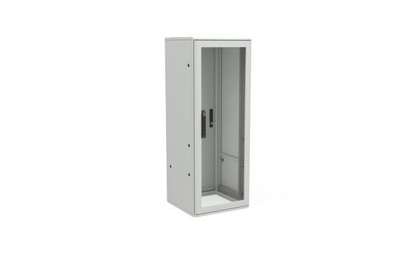 Vordertür aus 4 mm Einscheibensicherheitsglas ( ESG ), eingefasst in einen Aluminiumprofilrahmen.