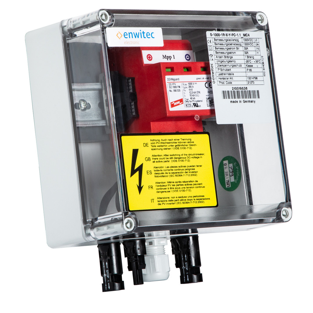 "Bem.-Isolierspannung Ui [VDC]: 1000 Bem.-Betriebsspannung Ue [VDC]: 1000 Anzahl unabhängige MPP Eingänge [n]: 1 Anzahl Stränge pro MPP IN [n]: 1 Anzahl Stränge pro MPP OUT [n]: 1 Bemessungsstrom InA (=Summe Isc STC) [ADC]: 32 Auslegungsstrom* Isc max [ADC]: 40 (=Summe Isc STC x 1,25) PRO STRANG: Bemessungsstrom Inc (=Isc STC) [ADC]: 32 Auslegungsstrom* Isc max [ADC]: 40 (= Isc STC x 1,25) Umgebungstemperatur: -25°C - +35°C (kurzzeitig 40°C) Überspannungsschutz: Klasse II/""C"" Sicherungshalter: - Sicherung: - Lasttrennstelle: - Eingang: MC4 Ausgang: MC4 Schutzklasse: II IP Schutzart: IP65 Konformität: IEC 61439-1/2 Art der Montage: Wandmontage Abmessungen:(BxHxT)mm 175 x 175 x 100 Gehäuse: Polycarbonat (PC) Gehäuse mit transparentem Schraubdeckel Montageart: Im Innenbereich oder im geschützten Außenbereich (KEINE direkte Bewitterung!) Einführungen 1x MC4-Paar am Eingang und 1x MC4-Paar am Ausgang Erde: 1x M20 (d= 6,0-13,0) * der Auslegungsstrom ISC MAX lt. VDE 0100-712:2016-10 beinhaltet den Faktor 1,25 für ISC STC des PV-Moduls, bzw. des PV-Stranges."