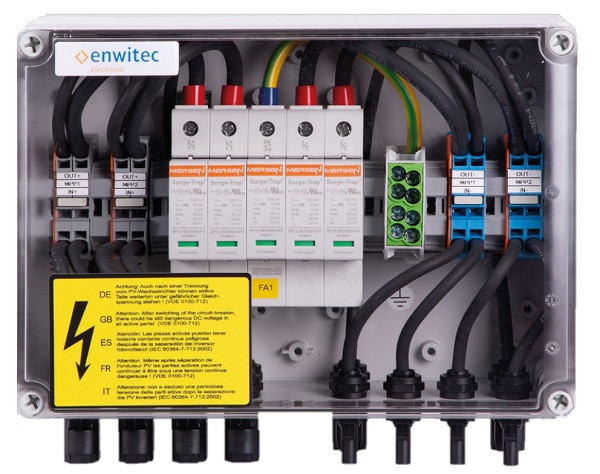 "Bem.-Isolierspannung Ui [VDC]: 1000 Bem.-Betriebsspannung Ue [VDC]: 1000 Anzahl unabhängige MPP Eingänge [n]: 2 Anzahl Stränge pro MPP IN [n]: 2 Anzahl Stränge pro MPP OUT [n]: 1 Bemessungsstrom InA (=Summe Isc STC) [ADC]: 64 Auslegungsstrom* Isc max [ADC]: 80 (=Summe Isc STC x 1,25) PRO STRANG: Bemessungsstrom Inc (=Isc STC) [ADC]: 16 Auslegungsstrom* Isc max [ADC]: 20 (= Isc STC x 1,25) Umgebungstemperatur: -25°C - +35°C (kurzzeitig 40°C) Überspannungsschutz: Klasse I-II/""BC"" Sicherungshalter: - Sicherung: - Lasttrennstelle: - Eingang: Sunclix Ausgang: Sunxlix Schutzklasse: II IP Schutzart: IP65 Konformität: IEC 61439-1/2 Art der Montage: Wandmontage Abmessungen:(BxHxT)mm 254 x 180 x 111 Gehäuse: Polycarbonat (PC) Gehäuse mit transparentem Schraubdeckel Montageart: Im Innenbereich oder im geschützten Außenbereich (KEINE direkte Bewitterung!) Einführungen 2x Sunclix-Paar am Eingang und 1x Sunclix-Paar am Ausgang bei jedem MPP Erde: 1x M20 (d= 6,0-13,0) 1x M12 Druckausgleichselement * der Auslegungsstrom ISC MAX lt. VDE 0100-712:2016-10 beinhaltet den Faktor 1,25 für ISC STC des PV-Moduls, bzw. des PV-Stranges."