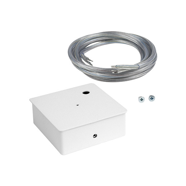 Quadratischer Deckenbaldachin aus pulverbeschichtetem Stahlblech zum Verbergen der Kabeleinführung für LENJA-Pendelleuchten. Enthält verzinkten Stahbügel mit Befestigungspunkt für das Drahtseil und 5-polige Anschlussklemme. Mit 5-poliger transparenter Anschlussleitung 5 x 0,75 mm² (Länge: 2 m). Eine abgehängte Montage der LENJA PDL ist auch an bis zu 50° schrägen Decken möglich.