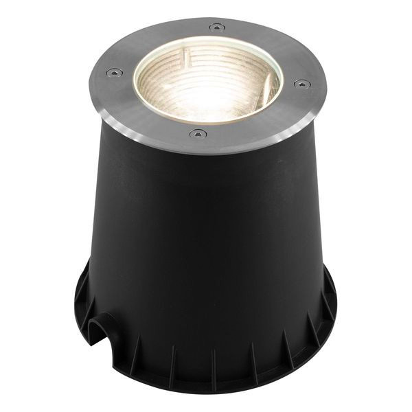 Der Leuchtenkörper ist aus Aluminium, die Abdeckplatte hingegen aus V2A-Edelstahl gefertigt. Die Kabeleinführung erfolgt über die am Boden befindliche Kabelverschraubung, welche für Kabel bis 10mm Durchmesser geeignet ist. Zur Vermeidung von Kondenswasser befindet sich auf der Unterseite der Leuchte ein selbstentlüftendes Entlüftungsventil. Das mitgelieferte LED-Modul kann bei Bedarf jederzeit ausgetauscht werden. Die maximale Überfahrgeschwindigkeit beträgt 20km/h, der Schwenkwinkel beträgt 20°. Außerdem ist die Leuchtmittelaufnahme drehbar gelagert. Zusätzlich ist ein mattes Schutzglas im Lieferumfang enthalten.