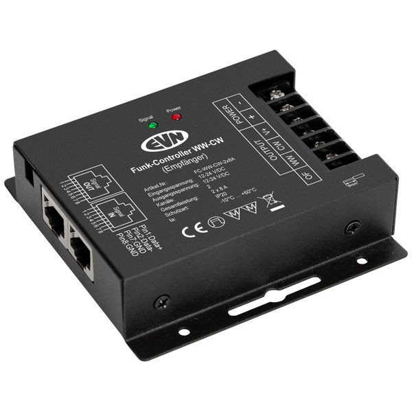 Funk-Controller-Empfänger für warmweiß-kaltweiß-LED-Leuchten. Geeignet für Leuchten mit einer Betriebsspannung von 12 und 24V/DC. Die tatsächlich zu verwendende Eingangsspannung ist abhängig von der benötigten Spannung der zu steuernden Leuchten. 1x Eingang für 12-24V/DC, 1x Ausgang für bicolor-LED-Leuchten, sowie 2x RJ45-Anschluss für Master-Slave-Anwendungen. Somit bietet der Controller zwei Möglichkeiten für größere Anlagen: Entweder wird das Steuersignal sekundärseitig mittels Repeater erweitert, oder es werden mehrere Controller über die RJ45-Anschlusse als Master-Slave verbunden. Die Schraubklemmen sind für Kabel bis max. 2,5mm² geeignet. Technische Daten: ta: -10°C - 60°C, tc: 60°C, max. Ausgangsleistung je Kanal: 8A, 96W bei 12V/DC und 192W bei 24V/DC. Kompatible Funk-Controller: WP-RGBW-w, HS-RGBW.