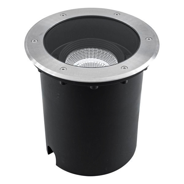 Der Leuchtenkörper der Bodeneinbauleuchte ist aus massivem Aluminium gefertigt, der obere Abdeckring hingegen aus V2A-Edelstahl und kann für vielfältige Anwendungen im Außenbereich verwendet werden. Die Montage erfolgt mittels der im Lieferumfang befindlichen Kunststoff-Einbauhülse. Über eine Justierschraube auf der Unterseite der Leuchte wird der gewünschte Schwenkwinkel eingestellt, somit muss die Leuchte selbst nicht geöffnet werden. Außerdem entstehen auch keine zusätzlichen Kosten für ein Vorschaltgerät, da der Anschluss direkt an die 230V-Zuleitung erfolgt. Zur Vermeidung von Kondenswasser befindet sich auf der Unterseite der Leuchte ein selbstentlüftendes Entlüftungsventil. Die Leuchte hat eine 0,50m lange Anschlussleitung (ÖLFLEX CLASSIC 110 BLACK 3 x 0,75mm²) mit freien Aderenden. Die maximale Überfahrgeschwindigkeit beträgt 20km/h. Der Ausstrahlwinkel beträgt 60°. Der Schwenkwinkel beträgt 25°.