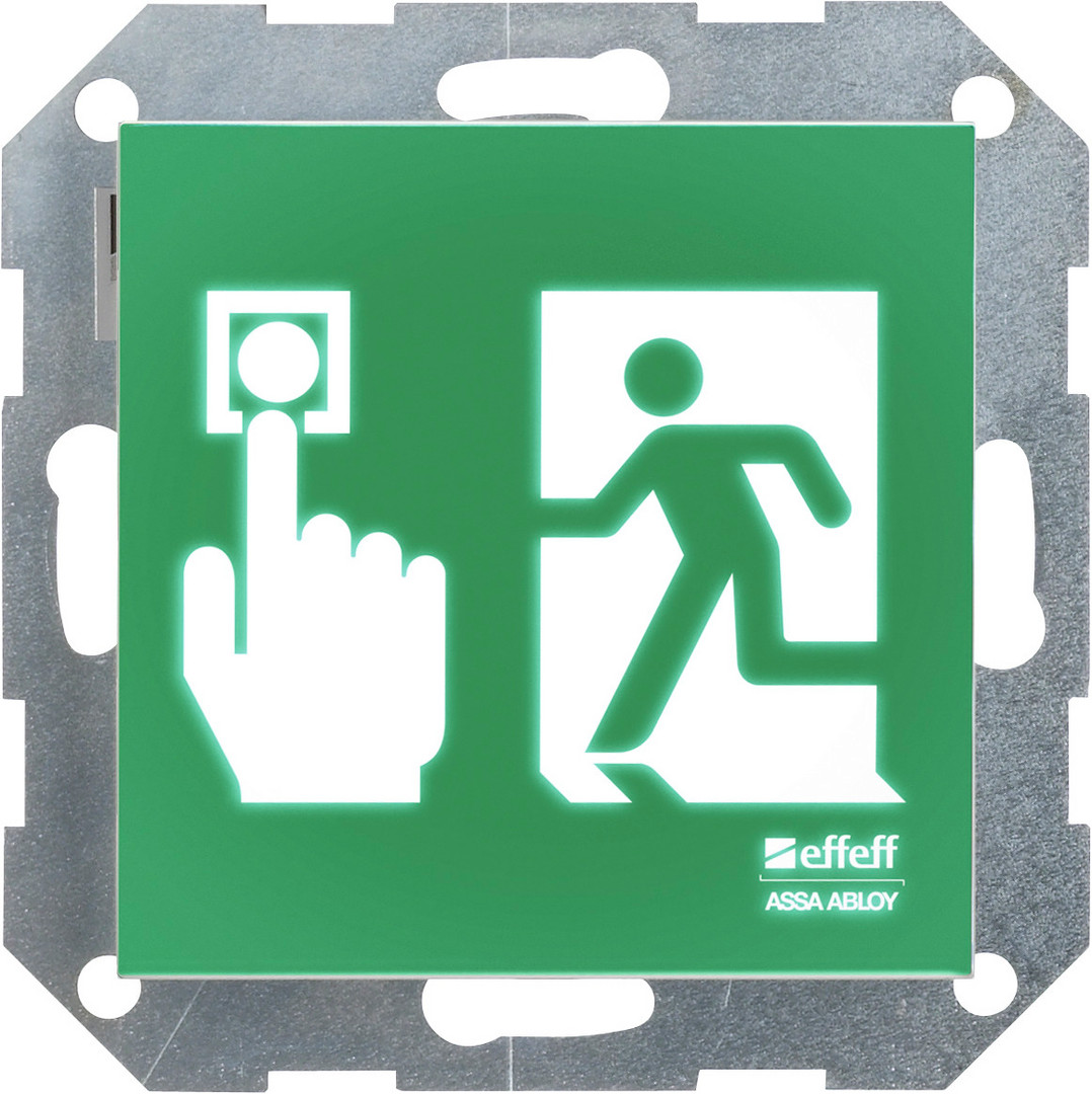 Für elektrisch gesteuerte Fluchttüranlage zur Kennzeichnung der Not-Auf-Taste.|Mit aktiver Hintergrundbeleuchtung und selbstklebendem Piktogramm nach DIN EN 13637:2015.|Zum Anschluss an effeff Fluchttürmodule 1384/1385/1386D00 mittels Systemstecker.|Das Verbindungskabel ist im Lieferumfang enthalten.|Die Verwendung in Kombination mit 1380 Türterminals ist möglich.|Passend für 55 mm Schaltersysteme.