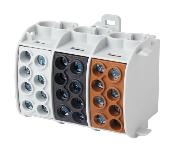HLAK3p35brswgr; Hauptleitungsabzweigklemme, 3-polig, 35 mm² ("L"); Zugang 6 x 35 mm², Abgang 6 x 25 mm²; Anschlüsse zertifiziert nach DIN VDE 0603-2; Mit Schnappbefestigung für waagerechte Montage