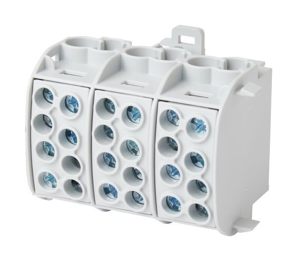 HLAK3p35br; Hauptleitungsabzweigklemme, 3-polig, 35 mm² ("L"); Zugang 6 x 35 mm², Abgang 6 x 25 mm²; Anschlüsse zertifiziert nach DIN VDE 0603-2; Mit Schnappbefestigung für waagerechte Montage