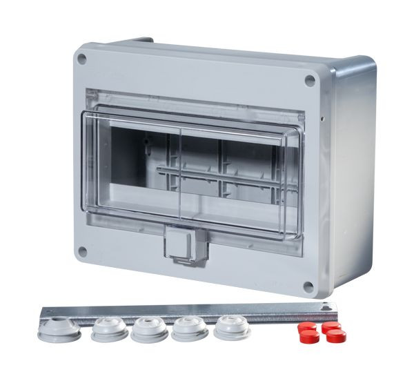 Feuchtraumraum-Kleinverteiler IP55, für Geräte bis 63A, Unter- und Oberteil aus hochwertigem Kunststoff, mit Tür aus transparentem, schlagzähem, witterungsbeständigen Kunststoff