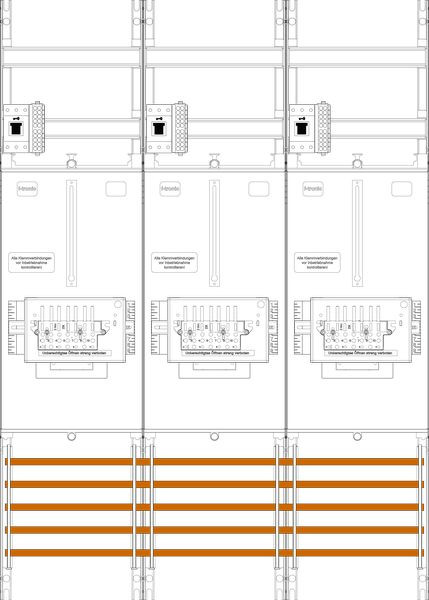Zählerfeld 3-feldrig, 3-Zählerplatz 3.HZ, Höhe 1050 mm, Breite 750 mm, Sammelschienensystem 5-polig, mit Zählersteckklemmen-Set und Hauptschalter sperrbar