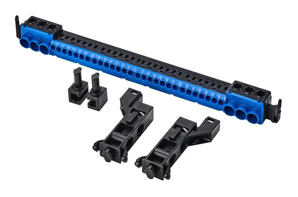 N-Steckklemme. Anschlüsse: schraubbar 6x 25 mm² steckbar 28x 4 mm². Farbe blau.