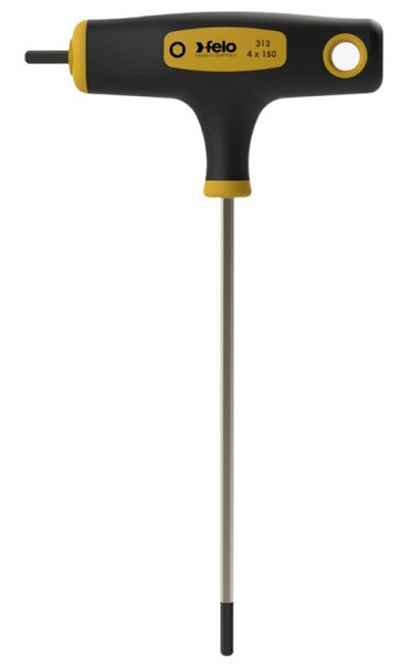 Felo 31304560 Doppelter metrischer Sechskant-T-Griff, 4,0 mm x 150 mm Langes Ende für präzises Eindrehen schwer zugänglicher Schrauben. Das Griffende verfügt über einen kurzen Schraubendreher für hohe Drehmomente. Aufhängeöse für einfache Aufbewahrung. Ergonomischer 2-Komponenten-Griff mit Softgrip-Beschichtung reduziert Druckstellen. Harter Kunststoffkern für Langlebigkeit, auch bei höchsten Drehmomenten. Matte Chrombeschichtung mit schwarzen Spitzen. Griffbreite: 100 mm. Klingenlänge: 150 mm. Oberfläche: Satinierte Chromoberfläche Griffmaterial: Mehrkomponentenmaterial Einzeln / Set: Einzelwerkzeuge Spitzenform: Sechskant Spitzengröße: Sechskant metrisch 4,0 mm