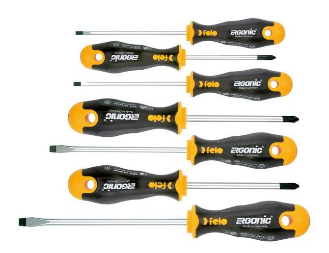Das Felo 40097118 Schraubendreher-Set enthält sieben Schraubendreher in verschiedenen Formen. Jeder Schraubendreher ist mit einer nahtlosen, glatten Kappe ausgestattet, die minimale Reibung in der Handfläche verursacht. Diese wird von einem ergonomischen 3-Komponenten-Griff gehalten, der aus einem durchgehend schlagfesten Hartkern aus PP-Kunststoff, einer druckflexiblen Polsterung und einer Beschichtung aus rutschfestem Elastomer besteht. Die Schraubendreher haben außerdem einen ergonomischen Griff, der sich der Hand anpasst und somit eine hervorragende Handhabung ermöglicht Felo Schraubendreher-Set, 7-teilig, ERGONIC 400 SL | PZ | Ph 4-fach Steckplatz SL-Serie 400: 3,5 x 100 mm, 4,0 x 100 mm, 5,5 x 125 mm, 6,5 x 150 mm 1x Kreuzschlitz PZ Serie 401: PZ 2 x 100 mm 2x Philips PH Serie 402: PH 1 x 80 mm, PH 2 x 100 mm Der ergonomische Griff passt sich jeder Benutzerhand an. mit Sechskantschlüsselhilfe Griffkopf mit Abrollschutz durchgehende Meißelklinge Klingen aus spezieller Chrom-Molybdän-Vanadium-Legierung gerade Flanken für besseren Halt und höheres Drehmoment Schwarze Spitze für optimale Präzision Kreuzloch zum Aufhängen von Werkzeugen oder zum Einführen eines Hebels Schraubensymbole auf der Griffkappe