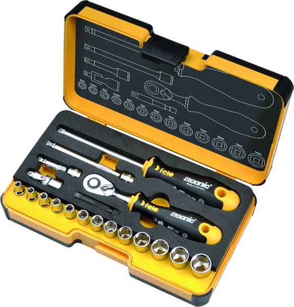 R-GO XL Box Zoll: 1/4 Zoll Werkzeug-Set mit Ergonic-Ratsche, mit Kissen-Effekt, Ratsche mit Steckschlüssel- Sicherheitsverriegelung, extrem starke Umschaltmechanik mit Super-Feinverzahnung (>100 Nm, 72 Zähne, 5° Rückholwinkel), der Griff ist unlösbar mit dem Schmiedeteil verbunden, hochwertig und langlebig: 15 Jahre Garantie auf jedes Stück, Inhalt: 13 Stecknüsse (1/8 Zoll - 19/16 Zoll), 2 Adapter, kurze- und lange Verlängerung, Gelenk, Ratsche