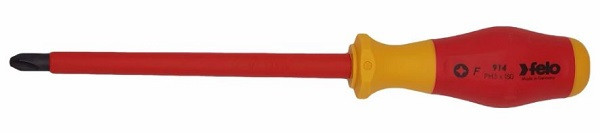 Felo 91430490 Dielektrischer Phillips-Schraubendreher PH3X150 Der dielektrische Kreuzschlitzschraubendreher der Serie 900 ist für Arbeiten mit PH3-Schrauben bei Spannungen bis zu 1000 V ausgelegt. Der ergonomische Griff und das rutschfeste Material (Soft Grip) sorgen für optimale Kraftübertragung. Dank der speziellen Konstruktion des Zweikomponentengriffs rollt das Werkzeug nicht weg. Die Klingen aus speziellem Chrom-Molybdän-Vanadium-Stahl gewährleisten beste Ergebnisse. Die schwarze Spitze (Black-Tip) sorgt für präzisen Sitz in der Schraube. Länge: 259 mm Breite: 35 mm Höhe: 35 mm Gewicht: 202 g Land: Deutschland Spline-Typ: PH Schlagfestigkeit: Nein Durchschlagsfestigkeit: Ja