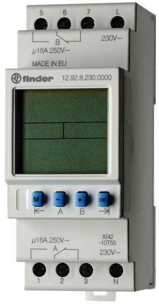 | Kurzbeschreibung | Schaltuhr für Reiheneinbau, Astroprogramm, Tages- und Wochenprogramm, 2 Wechsler 16 A, für 230 V AC |