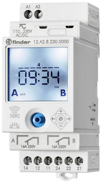 | Kurzbeschreibung | Schaltuhr für Reiheneinbau, Astro-Programm, Joystick-Programmierung, NFC-programmierbar, 2 Wechsler 16 A, für 12-24 V AC/DC |
