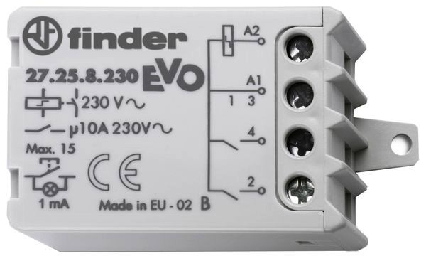 Stromstoßschalter EVO für Montage in Unterputzdose oder auf Chassis, 2 Schließer für 10 A / 250 V AC, max. Schaltleistungen bei 230 V AC: AC1-2.300 VA, AC15-500 VA, Glüh- und Halogenlampen- 1000 W, Leuchtstofflampen kompensiert 360 W, Leuchtstofflampen unkompensiert-400 W, Energiesparlampen 200 W, LED (230 V AC) 200 W, NV-Halogenlampen oder LED mit EVG 200 W, NV-Halogenlampen oder LED mit KVG 400 W, Schaltfolge: aus aus/aus an/an aus/ an an, Kontaktmaterial AgNi, Spule mit Überhitzungsschutz. Relaisschutzart: IP 20