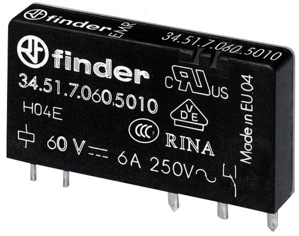 Schmales Steck-/Printrelais 1 Wechsler für 6 A/250 V AC, Kontaktmaterial AgNi-hartvergoldet, Spulendaten 60 V DC, 0,170 W, 19700 Ohm, Relaisschutzart: RT II