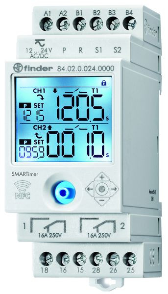 Multifunktions-Zeitrelais SMARTimer für DIN-Schienenmontage, Reiheneinbaugerät, digital, 2 unabhängige Wechsler für 16 A, 2 unabhängige Starteingänge (S1/S2), ein gemeinsamer Reset-Eingang (wählbar pro Kanal oder beide Kanäle), Kontaktmaterial AgNi, max. Einschaltstrom: 30 A, 25 Zeitfunktionen sind programmierbar: Funktionscodes: OFF, ON, AI, DI, GI, LI, PI, SW, SP, AE, BE, CE, DE,EE, FE, EEa, EEb, WD, GE, LE, PE, IT, SS, PS und SHp. Zeitbereiche: 0,1 s bis 9999 St., Versorgungsspannung 12 bis 24 V AC/DC (50/60 Hz). 2 Programmiermodi: im Smart-Modus mit einem Smartphone über NFC-Kommunikation oder Classic Modus mit dem Joystick. Baubreite 35 mm, Relaisschutzart: IP20.