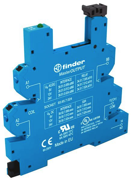 MasterOutput Relaisfassung mit Push-In-Klemmen, Farbe blau, für Relais 34.51 oder 34.81, mit Halte- und Demontagehebel, integrierte LED-Anzeige und EMV-Entstörbeschaltung des Eingangs. (Sichere Trennung) nach VDE 0106-Teil 101. Betriebsnennspannung 230 V AC.