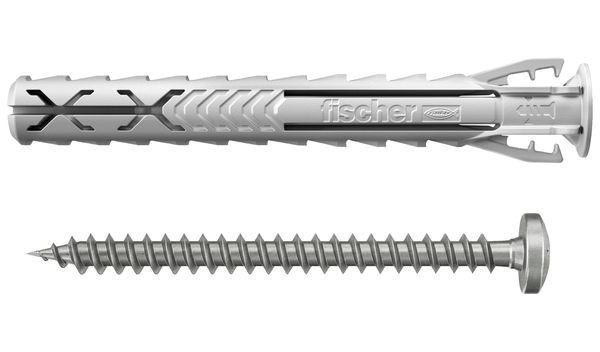 Der fischer Spreizdübel SX Plus ist durch seine 4-fach Spreizung der Spezialist für Vollbaustoffe wie Beton, Kalksandstein und Mauerwerk. Die speziellen Fixierflügel sorgen für eine Vorfixierung der Schraube, wodurch diese bei Überkopf Anwendungen nicht zusätzlich festgehalten werden muss. Diese Schraubenfixierung ermöglicht dem Anwender einen flexiblen und komfortablen Setzvorgang. Der flexible Dübelrand verhindert zudem ein Tieferrutschen des Dübels in das Bohrloch für eine sichere Montage. Die mitgelieferten Schrauben sind optimal auf den fischer Spreizdübel SX Plus abgestimmt. Das hochwertige Material aus Nylon garantiert dauerhaft sicheren Halt in einer Vielzahl von Voll- und Lochbaustoffen. Diese Variante mit größerer Verankerungstiefe ist Ideal für Befestigungen in Lochbaustoffen, Porenbeton und zur Putzüberdeckung geeignet.