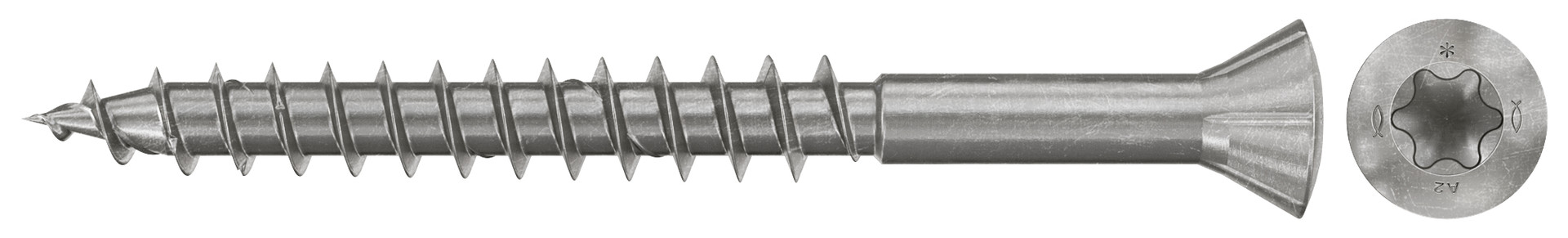 Die fischer Fassadenschraube FFSII-RT6 mit 60°-Senkkopf, Antrieb Innenstern TX und Teilgewinde ist ideal zur Befestigung von Holzfassaden, vor allem auch aus Laubhölzern. Für die Verwendung in Laubhölzer und lackierten Oberflächen empfehlen wir die Schrauben vorzubohren. Die Schraube aus Edelstahl A 2 mit kleinem Senkkopf ermöglicht eine oberflächenbündige Verschraubung. Dabei sind randnahe Verschraubungen ebenfalls möglich. Der Innenstern-TX-Antrieb ermöglicht höchste Kraftübertragung bei maximaler Bitstabilität. Die innovative Spezialgewindeform erleichtert das Einschrauben. Das Teilgewinde erlaubt das Anziehen der Schalung an die Unterkonstruktion.