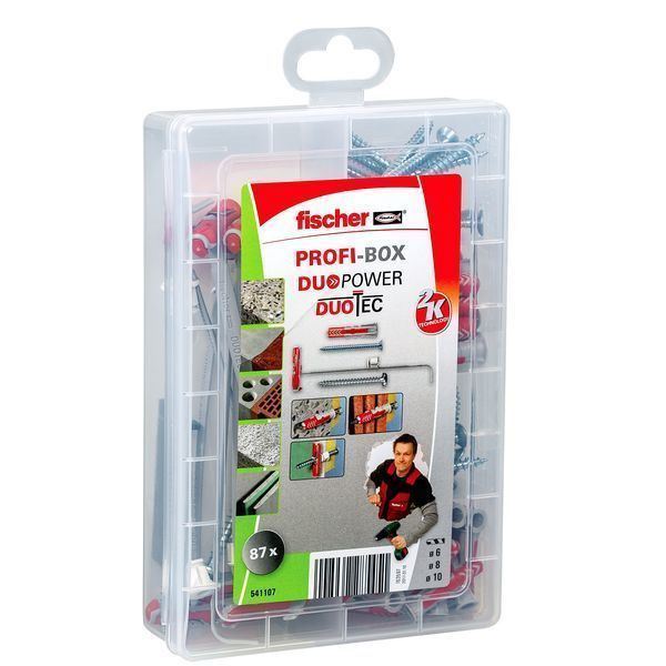 Die fischer Meister-Box DuoPower und fischer DuoTec enthält vorsortiert 30 DuoPower 6 x 30, 15 DuoPower 8 x 40 sowie 20 Spanplattenschrauben 4,5 x 40 und 10 Spanplattenschrauben 5 x 55. Außerdem enthält die Box 10 fischer DuoTec Hohlraumdübel sowie 6 Panheadschrauben 5 x 60. Die aus hochwertigem und schlagfestem Kunststoff gefertigte Meister-Box ist ideal für Werkstatt und Baustelle. Der transparente Deckel ermöglicht die Übersicht auf einen Blick. Die fischer Meister-Box verschließt sich fest und kann wieder mit Dübeln befüllt werden.
