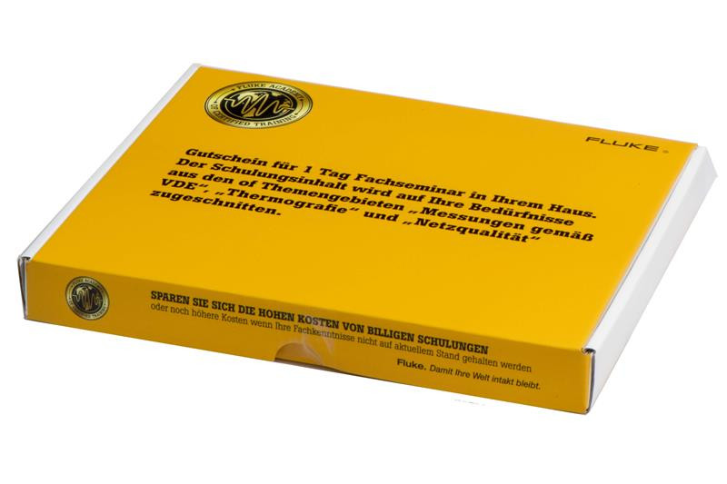 Seminar-Box mit Registrierungscode für ein 1-Tages Fachseminar in einem Fluke Seminarcenter. Folgende Themen stehen zur Auswahl: Geräteprüfung oder Thermografie Basiswissen oder Normkonforme Prüfung von Ladestationen.