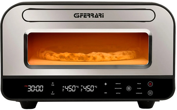Mit dem elektrischen Pizzaofen Pizza Pro 2 Minuti von G3 Ferrari gelingen Pizzen zu Hause so einzigartig und knusprig wie aus dem Steinbackofen der besten Pizzerien Neapels. Der G3 Ferrari Pizza Pro 2 Minuti erreicht Temperaturen von bis zu 450°C für perfekte Backergebnisse. Das Bedienfeld mit Digitalanzeige bietet sechs voreingestellte Programme zum Backen unterschiedlicher Pizzen von neapolitanisch bis dünn und knusprig, von Pfannenpizza bis Tiefkühlpizza und mehr: Manuale (manueller Modus), Napoletana (neapolitanische Pizza in 2 Minuten), Sottile (römische Pizza, dünn und knusprig), Teglia (Pizza auf Blech), Surgelata (Tiefkühlpizza), Pulizia (Pyrolyse zum Reinigen des Steins). Die Hitze wird im Stein gespeichert und gleichmäßig an den Teig abgegeben, das Ergebnis ist ein besonders gleichmäßig knuspriger Boden, ohne dass der Belag austrocknet. Die beiden getrennt regelbaren Heizelemente leisten 1.200 Watt Oberhitze, 500 Watt Unterhitze und erreichen Temperaturen von bis zu 450°C, wie bei den traditionellen italienischen Pizzerien. Durch das 3-fach isolierte Sichtfenster und die Innenbeleuchtung kann der Backvorgang genau verfolgt werden. Ein 30cm Ø Pizzaschieber ist im Paket enthalten, und in der Bedienungsanleitung finden sich zahlreiche köstliche, original italienische Rezepte.