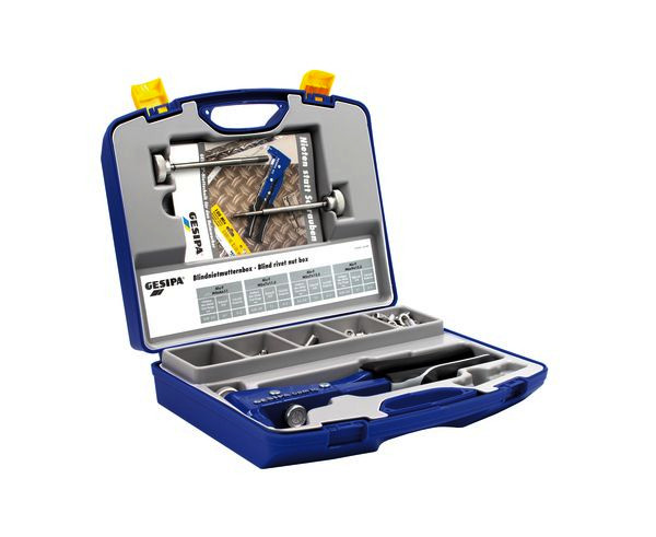 Blindnietmuttern-Box GBM 10 mit Gewindedorn und Mundstück M5 inklusive Gewindedorne und Mundstücke M4 und M6, verschiedene Blindnietmuttern-Abmessungen M4 bis M 6 aus Alu für Fügegutstärken von 0,25 bis 3 mm. Inkl. 4 Blindnietmuttern-Abmessungen: Alu M4 x 6 x 11,0 mm Alu M5 x 7 x 11,5 mm Alu M5 x 7 x 13,5 mm Alu M6 x 9 x 15,5 mm