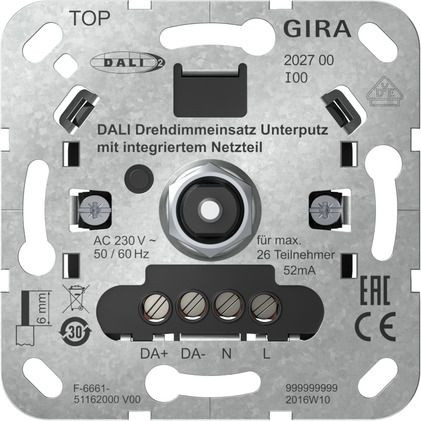 - DALI Drehdimmeinsatz Unterputz mit integriertem Netzteil für bis zu 26 DALI Teilnehmer.