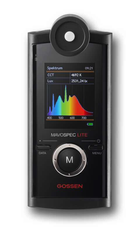 Spektrometer für den Praktiker mit LUX, CCT, CRI. Das puristische MAVOSPEC LITE ermittelt neben der Beleuchtungsstärke nur die unbedingt erforderlichen Messgrößen für eine moderne Beleuchtung. Basis dafür ist das Lichtspektrum aus dem alle Werte berechnet werden.. Das MAVOSPEC LITE ermittelt mit Beleuchtungsstärke, Farbtemperatur, Farbwiedergabe, Farbkoordinaten und spektraler Leistungsverteilung alle Kenngrößen die für eine praxisorientierte Beurteilung von modernen Beleuchtungen unbedingt erforderlich sind. . Konfigurierbare Messwertanzeige Hervorragende temperaturkompensierte Messwertstabilität Großer 4 GB Messwertspeicher, auslesbar über USB, wie externes Laufwerk am PC Dauerbetrieb über USB mit Powerbank, Steckernetzteil oder am PC EXCEL Makros für Protokollierung und Datalogging Messgerät und Kalibrierung aus einer Hand!. Messfunktionen Beleuchtungsstärke, Messbereich: 10 lx ... 100 000 lx, Genauigkeit: +/- 3 % Farbtemperatur Farbtemperaturdifferenz zum Planck'schen Kurvenzug Farbwiedergabe CIE13.3 Gammut Area Index Farbkoordinaten nach CIE1931, CIE1960, CIE1976 Sonstiges Spektralbereich: 380 nm ... 780 nm Versorgung: Li-Ion Akku 3,7 V - 890 mAh Schnittstelle: USB 2.0 mit USB Mini Buchse Speicher: 4 GB. 1 x MAVOSPEC LITE 1 x LI-Ion Akku 1 x USB Schnittstellenkabel 1 x Steckernetzteil 1 x Speicherkarte 4 GB Micro SD 1 x EXCEL Auswertung / Datalogger (Download) 1 x Neoprenetui 1 x Trageleine 1 x Bedienungsanleitung D/GB 1 x Kalibrierprotokoll