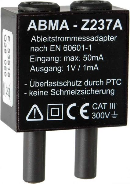 Ableitstrommessadapter. Zubehör zur Messung von Ableitströmen und Patientenhilfsströmen mit einem Multimeter. Der Ableitstrommessadapter ABMA dient als Vorsatz für Echteffektivwert-Multimeter zum Messen der Berührungsspannung nach VDE 0100-710 (Ersatz für DIN VDE 0107 Absatz 10) und zur Messung von dauernd fließenden Ableit- und Patientenhilfsströmen gemäß DIN EN 62353: 2014 bzw. IEC 60601-1: 2005/A1: 2012 (Medizinisch elektrische Geräte - Allgemeine Festlegungen für die Sicherheit). Überlastschutz durch PTC: Dieser stellt sich nach Ansprechen und Trennen vom Eingangskreis automatisch zurück - im Gegensatz zu einer Schmelzsicherung.. Eingang Eingangsstrom: 0...50 mA a.c., d.c. Messwiderstand: 1kOhm 1,0% Überlastschutz: PTC max. Eingangsstrom: 150 mA a.c., d.c. Ausgang Ausgangsspannung 0...50 V (1 V/ mA) a.c., d.c. Ausgangswiderstand: 10 kOhm Frequenzgang: gemäß EN 60601-1 Sicherheit Messkategorie: CAT III 300 V Anschlüsse Eingang: 2 x 4mm Sicherheitsbuchsen, Abstand 19 mm nach Norm Ausgang: 2 x 4mm Sicherheitsstecker, Abstand 19 mm nach Norm . 1 Ableitstrommessadapter 1 Bedienungsanleitung 1 Kalibrierprotokoll