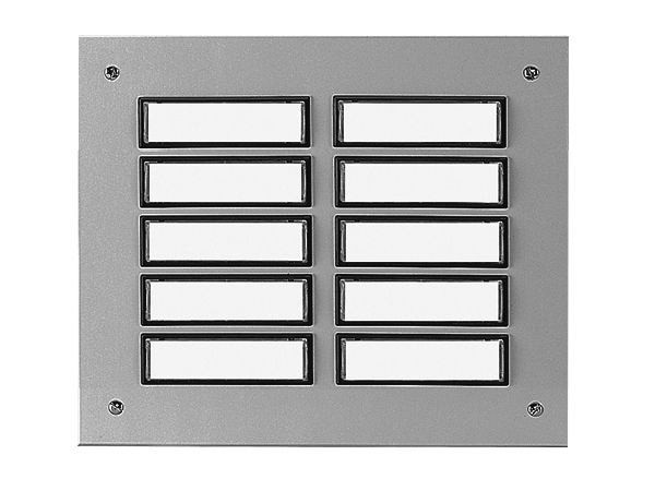 Breite: 202 mm Aluminium Etagenplatte 855 EV1 Der ETA 855 besteht aus Aluminium und hat eine silber eloxierte glatte Oberfläche, was ihn hervorragend gegen Korrosion und Verwitterung schützt. Mithilfe einer Soffitte haben Sie die Möglichkeit, die Flächentaster / Namensschilder des ETAs zu beleuchten. Hinweis: UP-Kasten bitte separat bestellen, Art.-Nr. 55895 Soffitte nicht inklusive! Für die Beleuchtung des Tasters / Namensschildes bitte folgende Soffitte mitbestellen, Art.-Nr. 51016 / 51037. Pro Klingeltaster wird eine Soffitte benötigt. Die Befestigungsbohrungen sind jeweils 16 mm von der Außenkante entfernt.