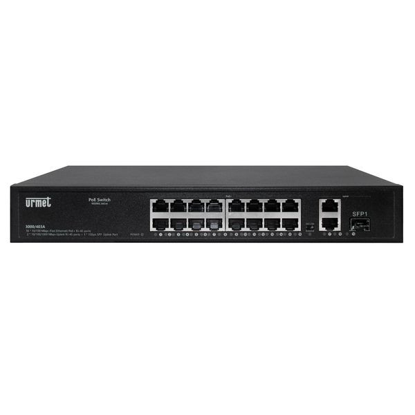 16 PoE Ports 10/100M, 2 Uplink Ports, 1 SFP Port, PoE Leistung Einzelport 15,4 / 30 W, Gesamtlöeistung PoE Ports 250 W