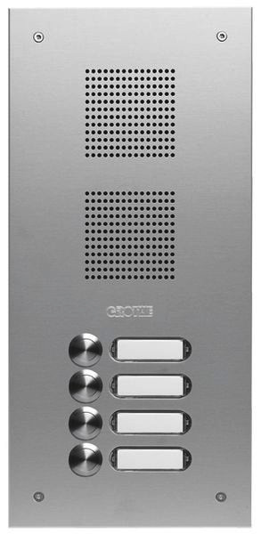 Die Serie ROBUSTA ist ausgestattet mit Eigenentwicklungen aus unserem Hause, wie z. B. den Tastern der Serie PROTACT oder dem LED-Namensschild. Bei diesem Artikel handelt es sich um eine bündig abschließende Unterputz-, Audio-Türstation mit insgesamt vier Klingeltastern und vier Namensschildern. Der PROTACT Klingeltaster mit seiner taktilen Rückmeldung gibt Ihnen ein angenehmes Gefühl beim Betätigen und das Namensschild rundet visuell nochmals mit seiner LED-Beleuchtung die Front ab. Die 2,5 mm dicke Frontplatte ist aus Aluminium (Silber eloxiert), was der Türstation einen edlen Look verschafft. Neben dem verzinktem Unterputzkasten und den diebstahlsicheren Befestigungsschrauben, besitzt die ROBUSTA einen integrierten Lautsprecheradapter und bietet Ihnen zusätzlich so die Möglichkeit einen GROTHE Lautsprecher einzubauen. Der patentierte Lautsprecheradapter bieten mit den getrennten Kammern sowie dem Wasserableitsystem eine optimale Akustik und den besten Schutz gegen Witterungseinflüsse.